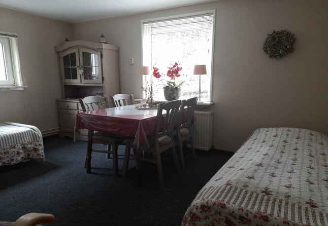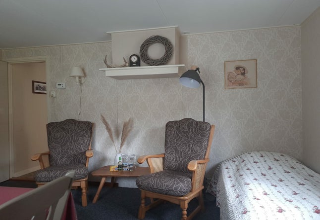 - Kamer/slaapkamer: Eethoek met vier stoelen. Salon tafeltje met twee makkelijke stoelen
